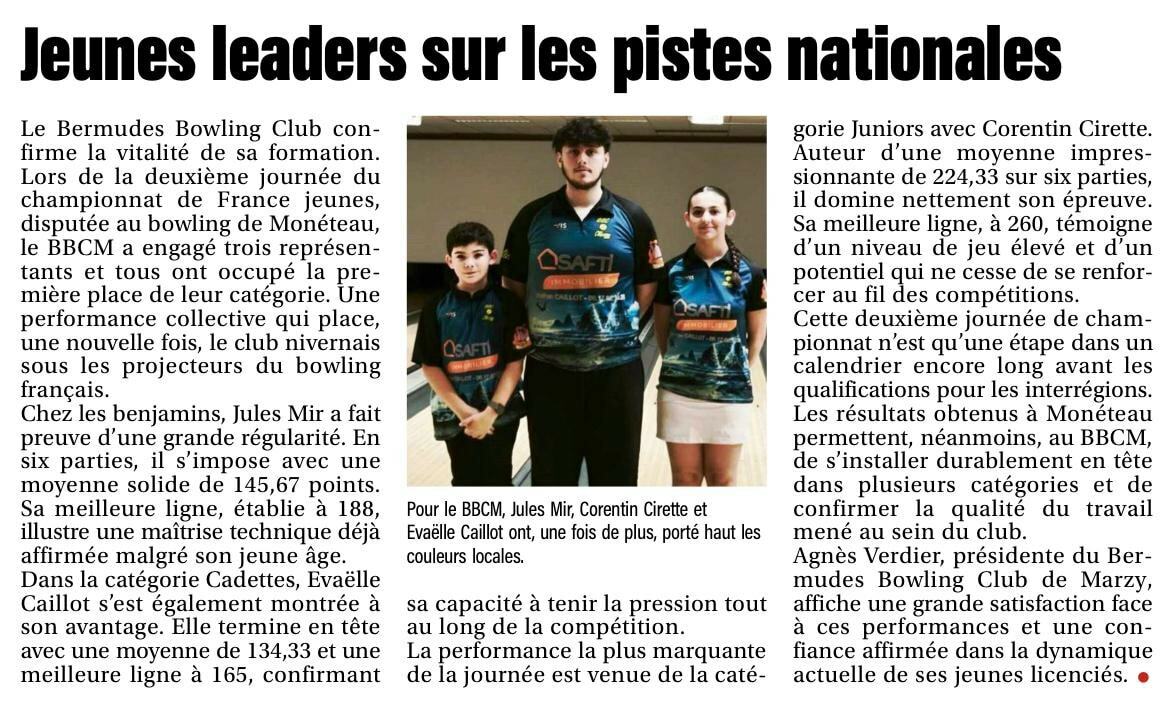 Lors de la deuxième journée du championnat de France jeunes, disputée à Monéteau, nous avons une nouvelle fois brillé grâce à nos jeunes licenciés. Nos trois représentants ont chacun terminé à la première place de leur catégorie, confirmant la qualité de la formation du Bermudes Bowling Club de Marzy.